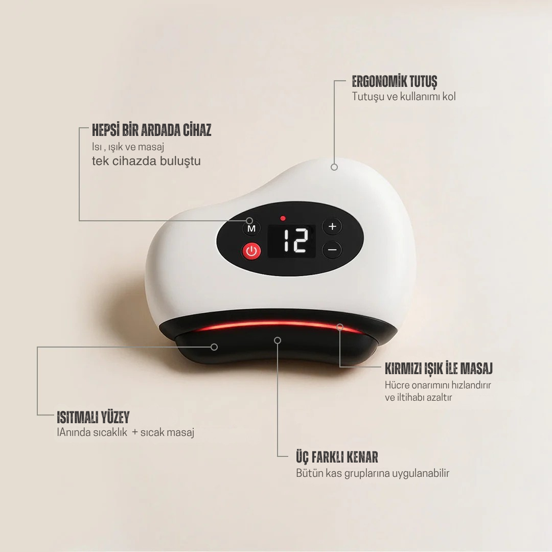 Profesyonel terapistler bu kombinasyonu onlarca yıldır kullanmaktadır. Isı kan akışını artırır, titreşim yara dokusunu parçalar ve hedeflenen basınç tetik noktalarını serbest bırakır. Artık aynı kanıtlanmış yöntemi evde, çok daha düşük bir maliyetle kullanabilirsiniz.
